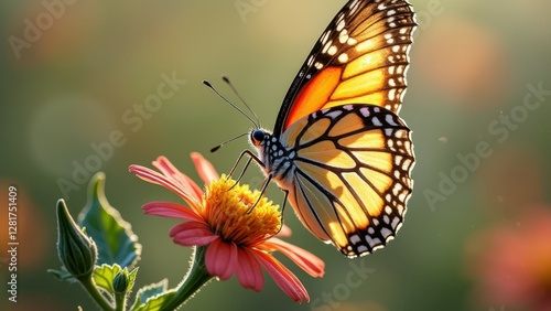 © Beniamin, Obraz premium Monarch butterfly on vibrant flower with sunlit wings in natural setting