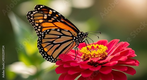 Fototapeta premium Monarch Butterfly on Zinnia Flower Vibrant Wings and Delicate Petals in a...