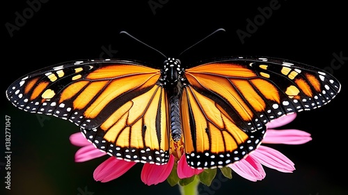 © Zhafran, Fototapeta premium Monarch butterfly perched on a pink flower against a black background.