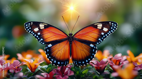 © Edhar, Fototapeta premium Monarch butterfly perched on vibrant flowers in sunny garden