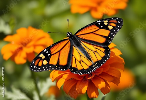 © Rini, Fototapeta premium Monarch butterfly perched on vibrant orange flower.