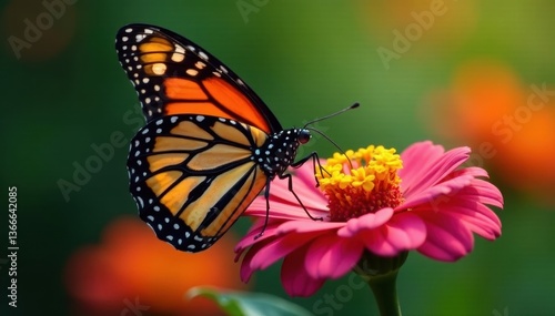 Naklejka premium Monarch butterfly perched on vibrant zinnia bloom , closeup, flora