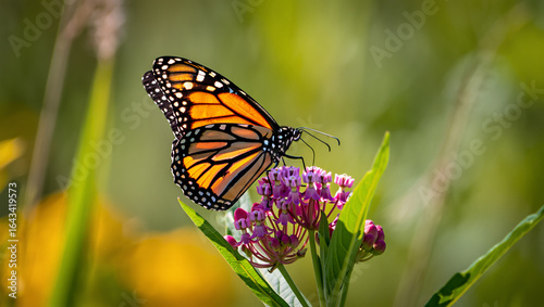© MstNurui, Fototapeta premium Monarch butterfly resting on a purple wildflower in a sunny meadow