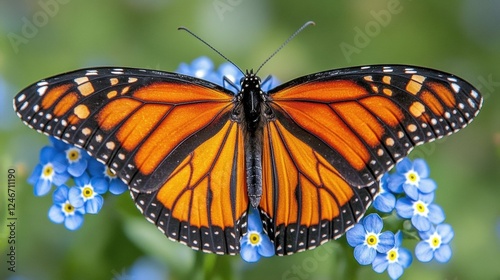© wannathon, Fototapeta premium Monarch Butterfly Resting on Bright Blue Flowers in Garden Setting
