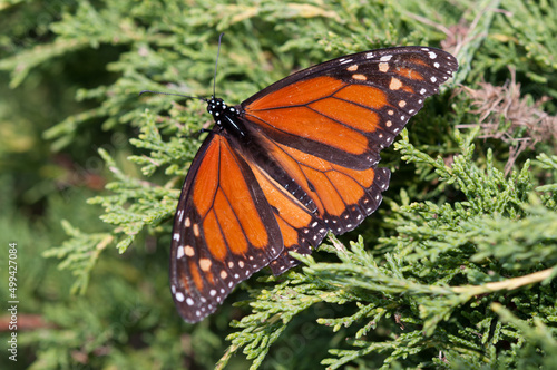 Fototapeta premium monarch butterfly resting on evergreen shrub