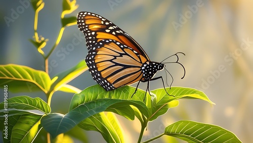 © miracle, Fototapeta premium Monarch Butterfly Resting on Lush Green Foliage