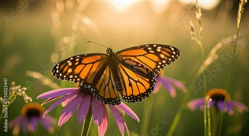 © MDRifat, Fototapeta premium Monarch Butterfly Resting on Purple Coneflower in Golden Sunlight