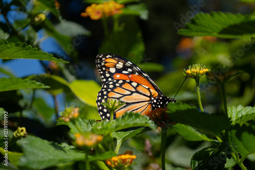 © Jeanpaul Solorzano, Fototapeta premium Monarch butterfly rests on a leaf surrounded by colorful vegetation