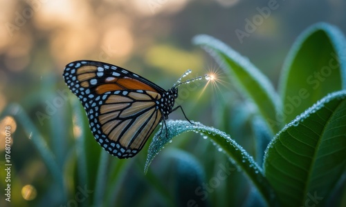 Fototapeta premium Monarch butterfly rests on dewy leaves at dawn
