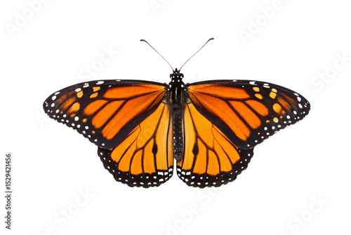 © Tanicsean, Fototapeta premium Monarch butterfly shown from different angle revealing orange and black wing pattern with white spots, isolated on a transparent background