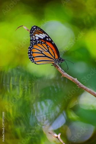 Fototapeta premium Monarch butterfly with beautiful nature background. Orange butterfly resting on a branch.