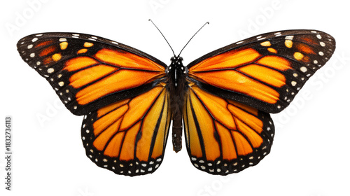 © Maestro, Fototapeta premium Monarch butterfly with intricate orange and black wings and white spots showcased against a clean backdrop, perfect for nature studies and entomology projects.