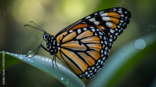 © Mobasshara, Fototapeta premium Monarch butterfly with orange and black wings perched on a green leaf