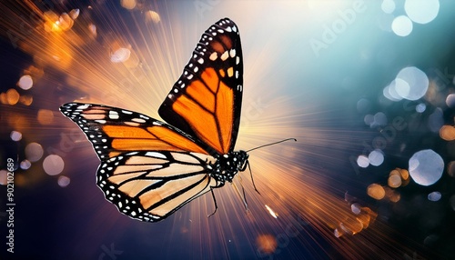 © Abele, Fototapeta premium Monarch butterfly with orange wings flies over an abstract background