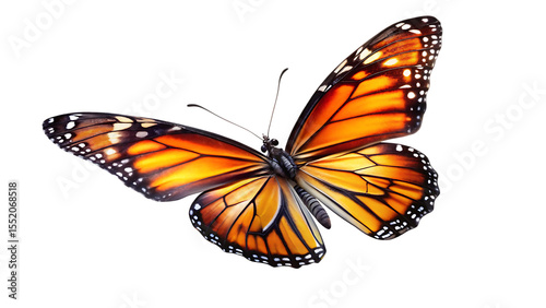 Fototapeta premium Monarch butterfly with vibrant orange and black wings in flight isolated on a...