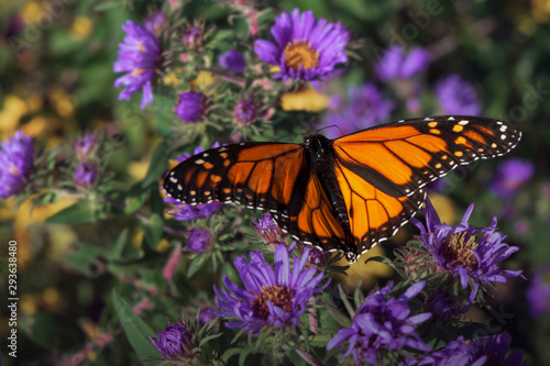 © Anna, Fototapeta premium Monarch butterfly with wings spread over purple asters