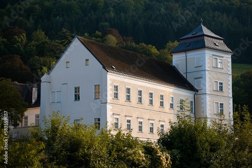 © Trio Stories/Wirestock Creators, Obraz premium Monastery in an Alpine town in Austria at sunset.