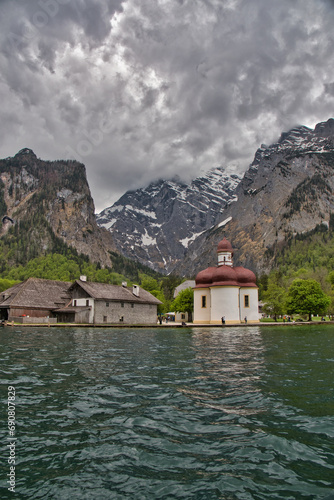 © Boerlinboi, Naklejka premium Monastery on the lake in front of a mountain