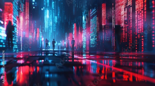 Obraz premium Monde numérique éclairé, graphiques financiers, silhouettes floues et...