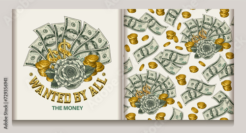Fototapeta premium Money pattern, logo with 100 US dollar notes, dollar fan with money rose, stacks of coins, text Wanted by all. Concept of success, wealth, luck, win. Vintage style. Not AI