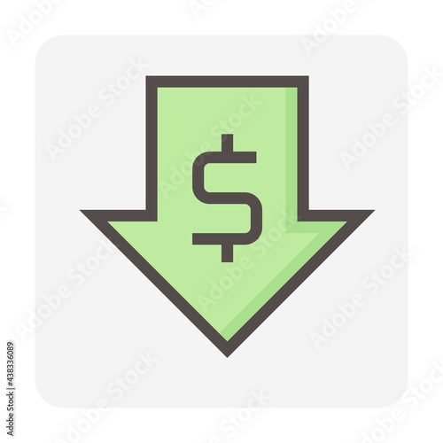 © DifferR, Fototapeta premium Money value decrease vector design. That icon, sign or symbol of dollar and big drop down arrow for business, economy and finance concept to reduce of profit, data, market price or income. 48x48 px.