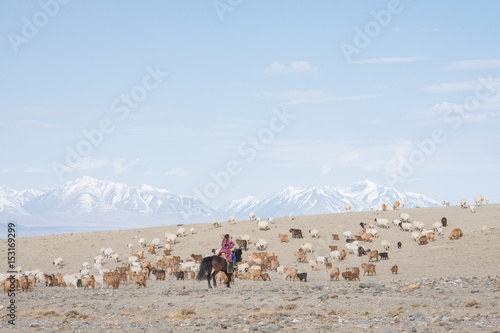© photollurg, Obraz premium MONGOLIA - 22 maja 2017: Pasterz dziewczyna siedzi na koniu i pasie stado owiec na prerii z ośnieżonymi szczytami gór na tle