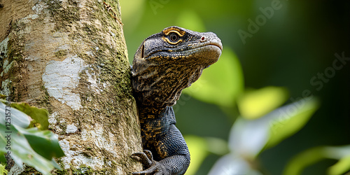 © Amonthep, Fototapeta premium monitor lizard climbing tree trunk, showcasing its unique features and vibrant environment