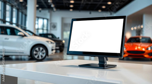© Rhony, Naklejka premium Monitor with blank white screen on table for mockup, with a background in a modern car showroom