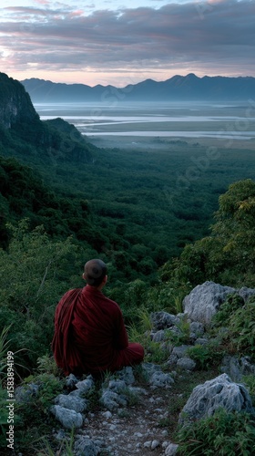 Naklejka premium Monk in meditation overlooks beautiful mountain landscape