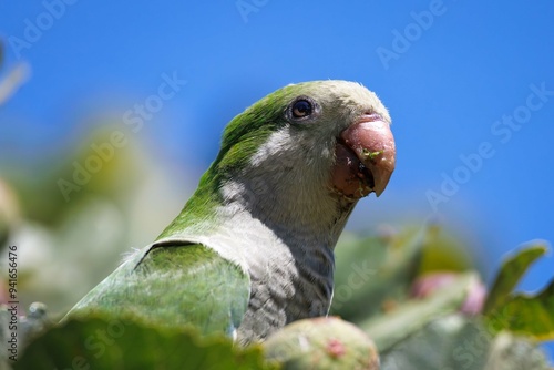 © Scholz Fotografie , Obraz premium Monk parakeet enjoys the taste of ripe figs.