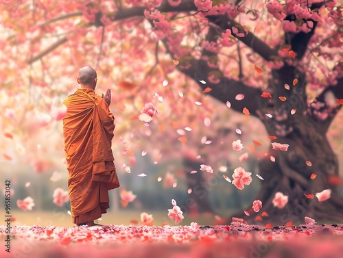 © Bussakon, Fototapeta premium Monk Praying Under Cherry Blossom Tree with Falling Petals in Serene Landscape