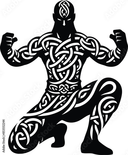 Fototapeta premium monk shaolin warrior in silhouete with celtic knot pattern illustration