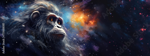 Fototapeta premium Monkey against cosmic background with space, stars, nebulae, vibrant colors,...