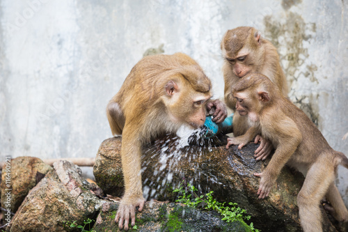 © SKT Studio, Naklejka premium Monkey drinking water from blue pipe