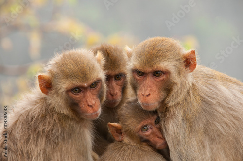 © CRSHELARE, Fototapeta premium Monkey family with babies, hugging each other, Red faced macaque, emotional photo.