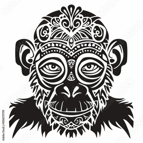 © Cloudyew, Obraz premium Monkey head silhouette adorned with intricate tribal patterns.