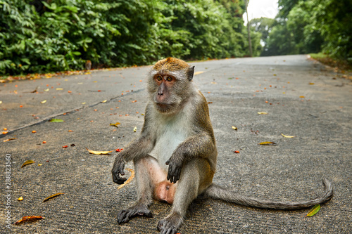Fototapeta premium monkey in the middle of the road alone, in the tropical jungle, flat three quarters, the distracted monkey