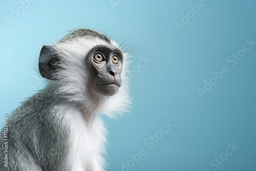 © Noufaldi, Obraz premium monkey isolated on blue background , copy space for text