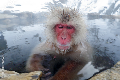 Fototapeta premium Monkey Japanese macaque, Macaca fuscata, red face portrait in the cold water...