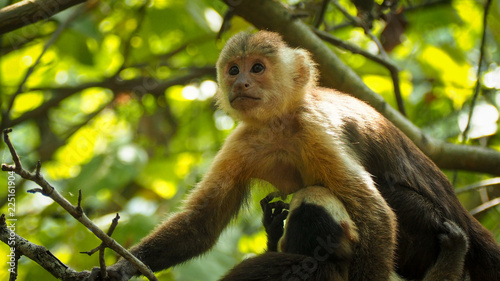 © iris, Fototapeta premium monkey mother breastfeeding her baby in the trees