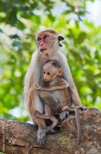 Obraz premium Monkey mother with a baby sits on a tree. Sri Lanka. An excellent illustration.
