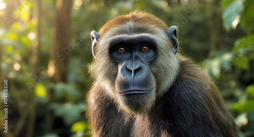 © arif, Fototapeta premium Monkey portrait expressive eyes, brown fur, leafy forest backdrop, sunlight