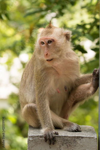 © Teeranon, Naklejka premium Monkey sit on concrete bridge looking around against tree in the background.