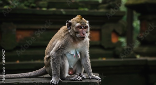 Obraz premium Monkey Sitting and Staring Intently in Lush Temple Setting