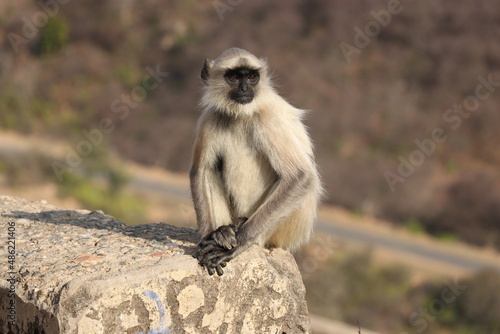 © OmKumawat, Obraz premium monkey sitting on old wall.