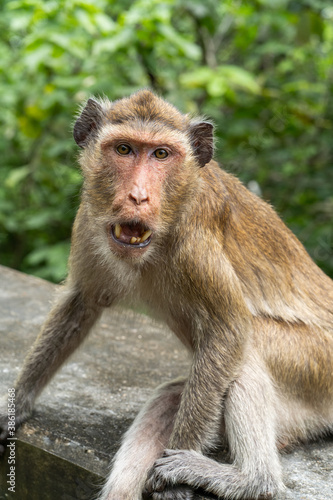 © littlestocker, Obraz premium Monkey sitting on the wall with nature background
