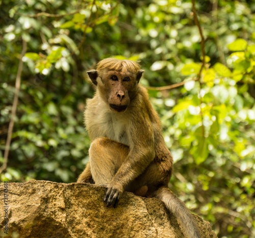 © Wirestock, Fototapeta premium monkey sitting on top of a large rock near trees and bushes