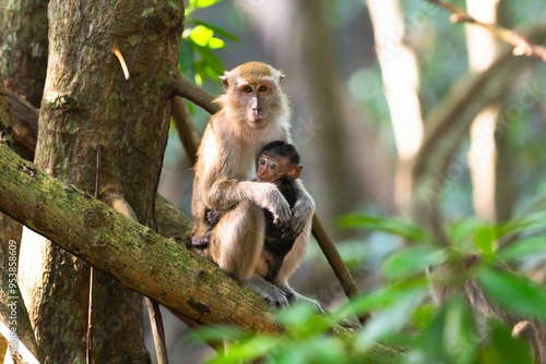 Fototapeta premium Monkey with newborn baby. Macaque in jungle.