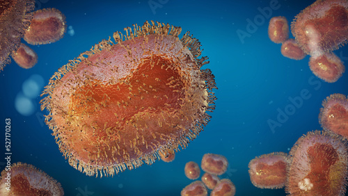 Naklejka premium Monkeypox virus, one of the human orthopoxviruses, pathogen closeup,...