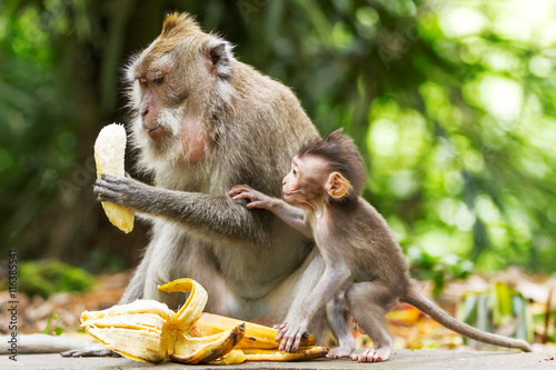 Naklejka premium Monkeys eat bananas. Monkey forest in Ubud, Bali, Indonesia.